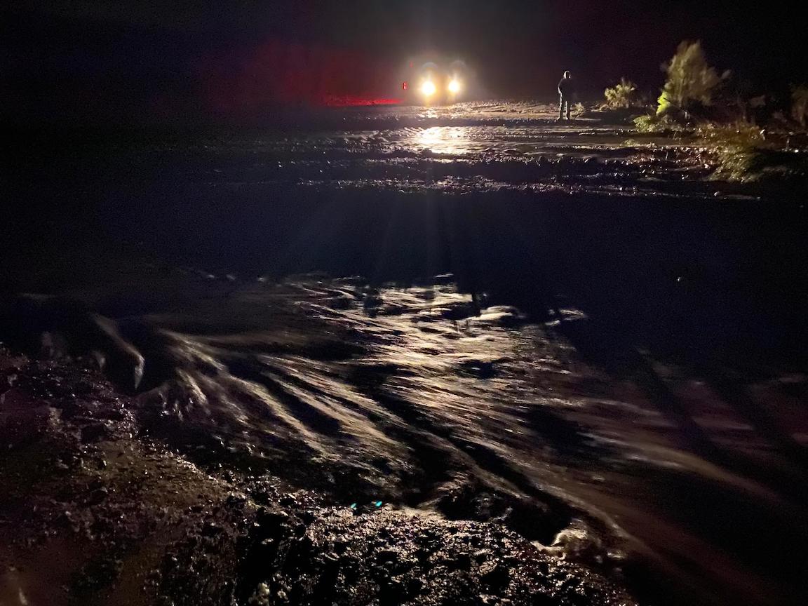 What we saw was incredible. The amount of sand and mud and debris over the pavement was incredible. We took it slow, picking our way across massive outpourings of earthen material carried onto the road from banks and streams. But what caught us off-guard, just a quarter mile before the start of the gravel was a standing pool of water two to three feet deep and over one hundred feet long. It was covered with a layer of mud such that it appeared, by the headlamp of the car, to be a continuation of the road. But once we were in the depth of it, it was too late to stop, turn around, or even switch to reverse for fear of flooding the air intake or tail pipe.