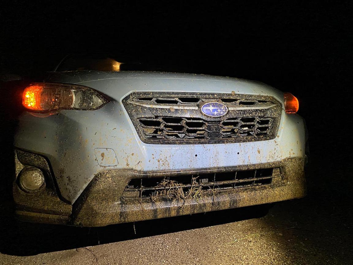 Deb and Bob made it across, driving their 4×4 pickup toward my headlamp as a beacon. Once they were clear and over the dark horizon, I spent another half hour clearing more barbed wire and debris on the far side, and plotting the best course for our car. I moved our Crosstrek down the road to the stream’s edge and eased it over the berm and into the flow. I then gave it gas and crossed the now three separate streams by way of rocks, branches, and mud. The final bit of mud, no more than a few inches deep, was incredibly soft, sucking at the tires such that we lost forward velocity even as I increased the engine’s speed and released the clutch fully in first gear. Fortunately, we reached clear gravel in time, and pulled up, and out of the far bank.